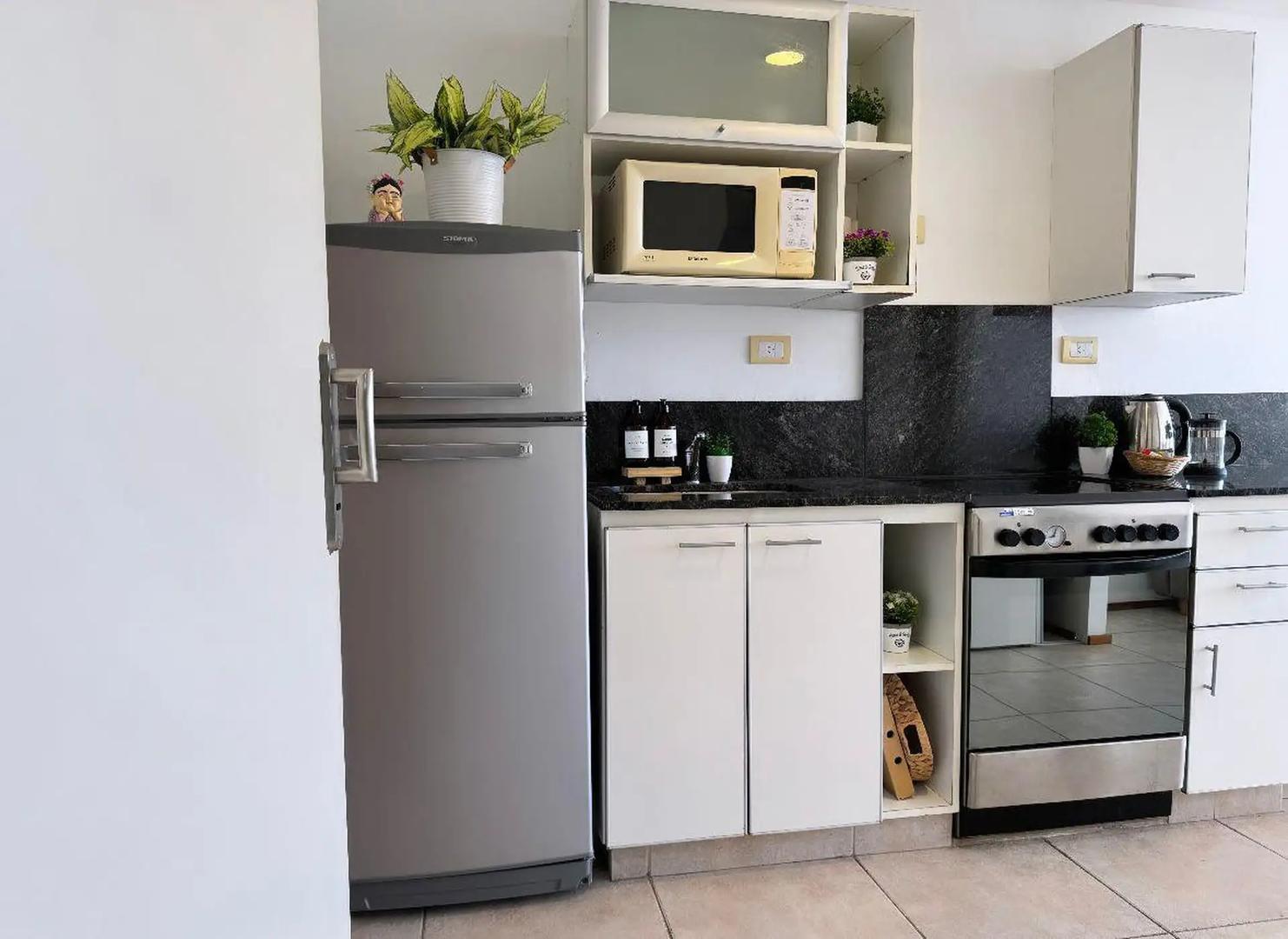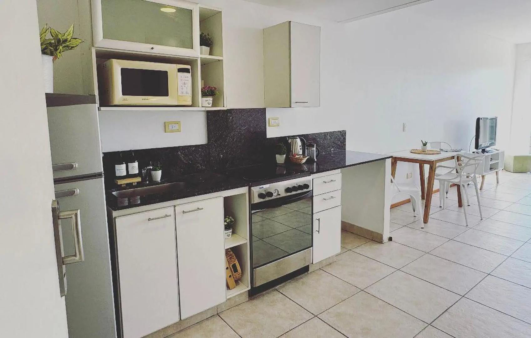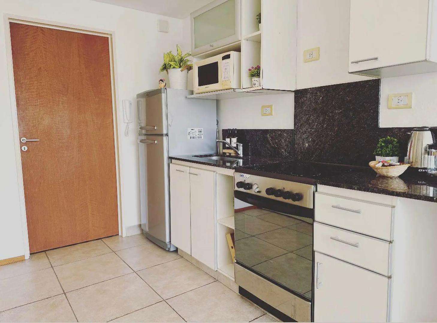 Cocina integrada completa con cocina eléctrica con horno, microondas y heladera con freezer. Baño completo con ducha.