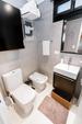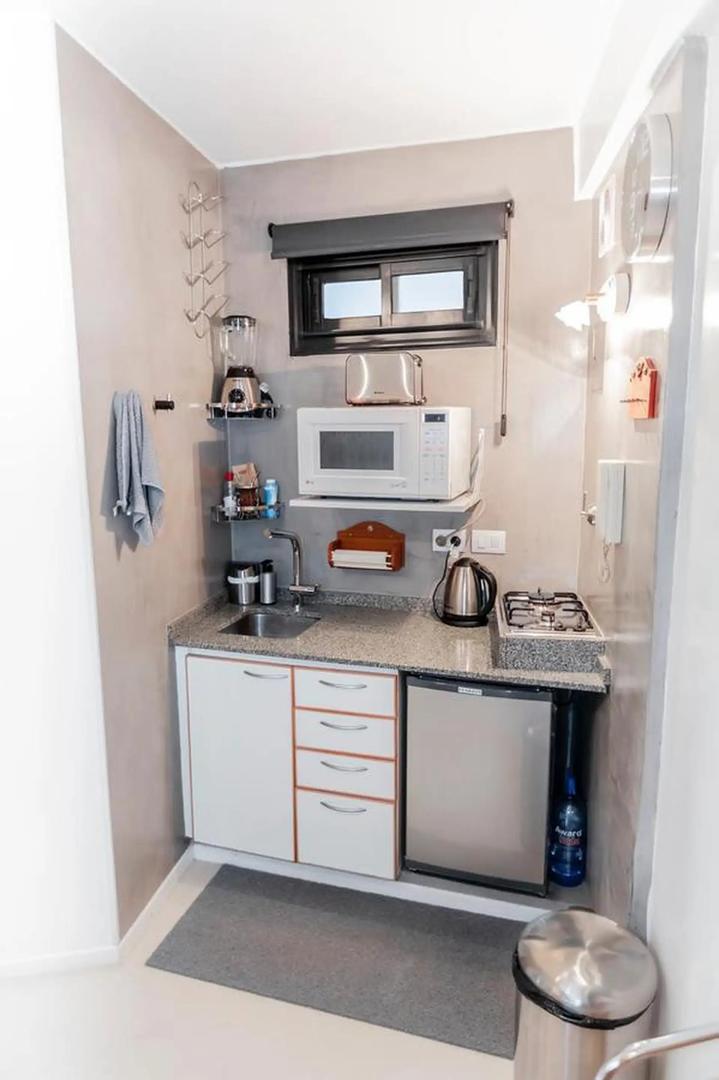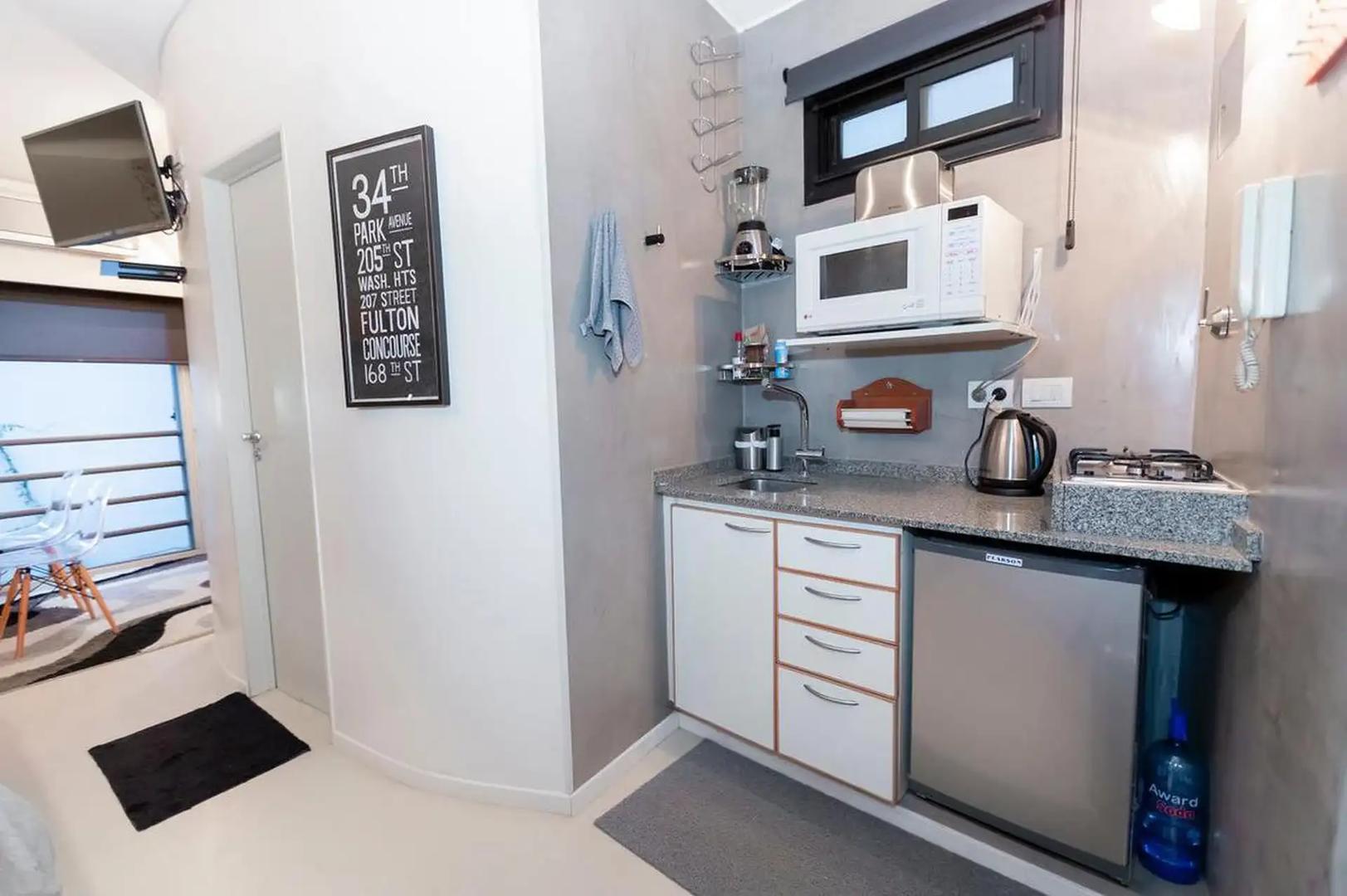 Cocina integrada con cocina a gas, microondas y heladera bajo mesada con congelador. Baño completo con ducha.